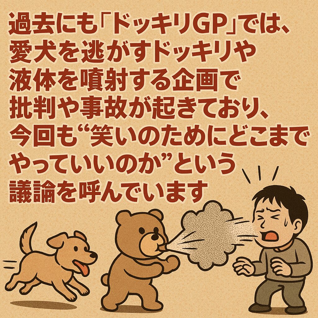過去にも『ドッキリGP』では、愛犬を逃がすドッキリや液体を噴射する企画で批判や事故が起きており、今回も“笑いのためにどこまでやっていいのか”という議論を呼んでいます。