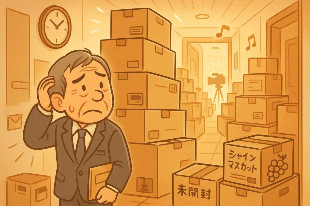 「7日に届いた宅急便7つ」「下はロマンティックプリンセスのワゴン」「その上にシャインマスカット」と本人が説明するほど、毎日のように優待品が届き、整理する暇もないほど。
