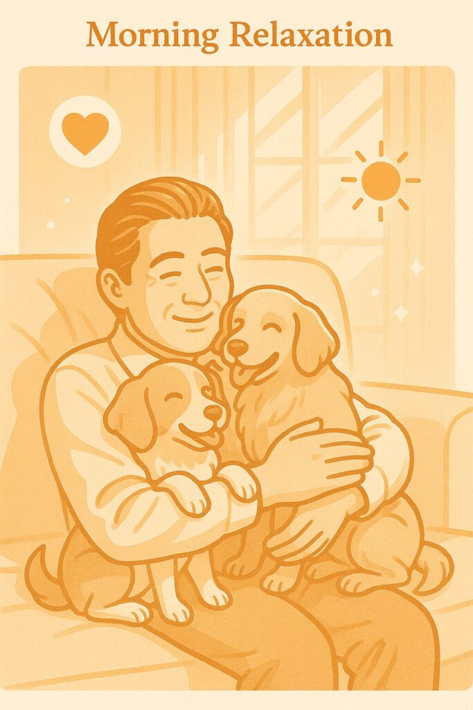 勝負のない朝、土俵の代わりに愛犬たちが待つリビングで過ごす穏やかな時間。