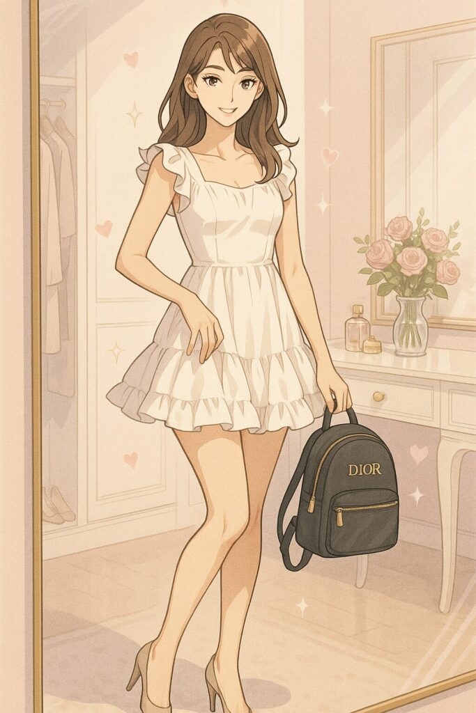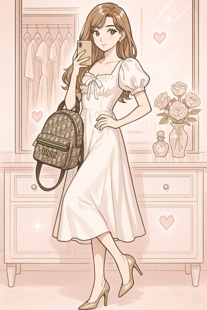 ブランドは人気のBibiy.、そこに約59万円のDiorバックパックを合わせた上品なコーディネートが話題に。