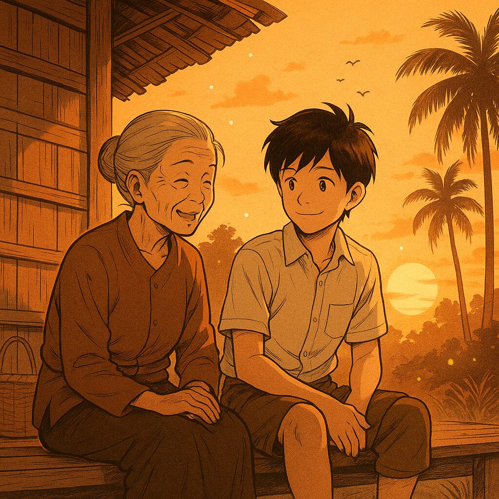 彼の心の奥には、いつも祖母の声と故郷の夕焼けが残っている。