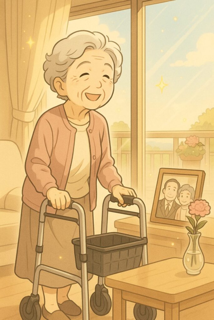 「車を押して歩けば、どこにでも行けるの。お医者さんも近いし、便利でありがたいの」と語る笑顔には、年齢を超えた前向きな力が宿っています。