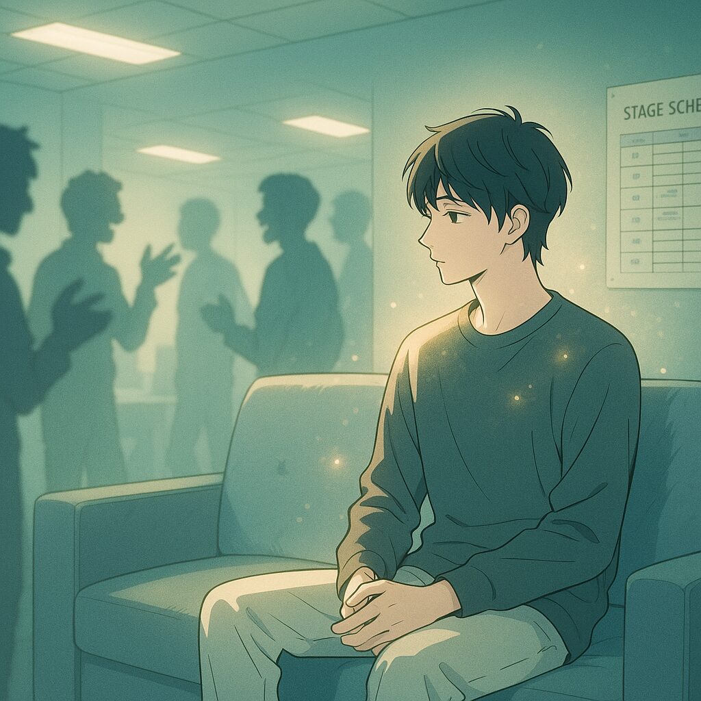 控室でみんながそれぞれ準備しているときも、山中柔太朗さんの近くには自然と柔らかい空気が流れます。