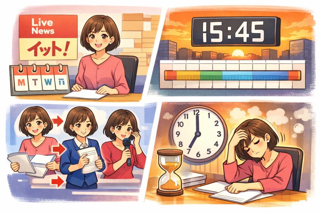とくに夕方のニュースは“毎日・長時間”の印象が強く、そこに特番やバラエティの進行が重なると、視聴者側の体感は一気に「働きすぎ」に寄って見えます。
