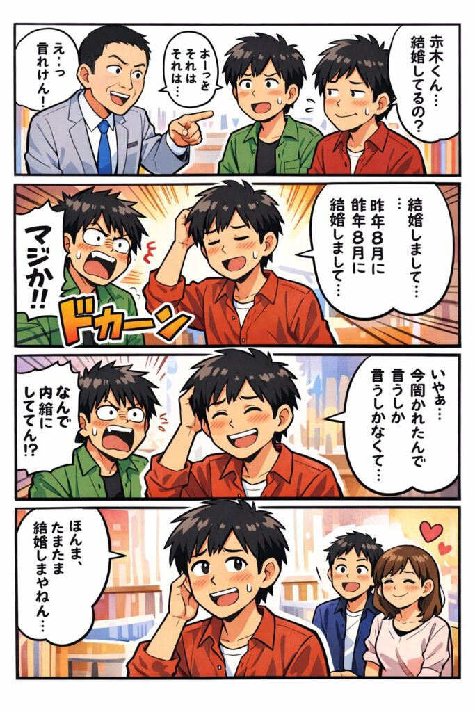 きっかけは番組中の何気ない会話。MCの東野幸治さんが相方に「結婚してるの?」と聞き、続けて赤木裕さんにも話が振られた流れで、赤木裕さんが口ごもりつつも「結婚しまして。昨年8月に結婚しまして」と告白したと報じられています。