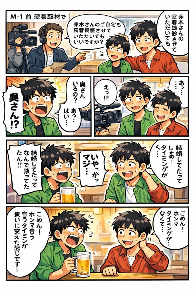 M-1前の密着取材で、ディレクターが「赤木さんのご自宅も…」と聞いたとき、赤木裕さんが「でも奥さんがいるので」と口にして発覚。