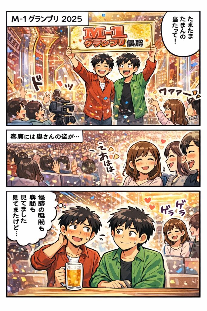 そこに「M-1の会場に妻がいた」というエピソードが重なり、優勝の瞬間を最も近い人が客席で見守っていた――という物語が一気に立ち上がりました。