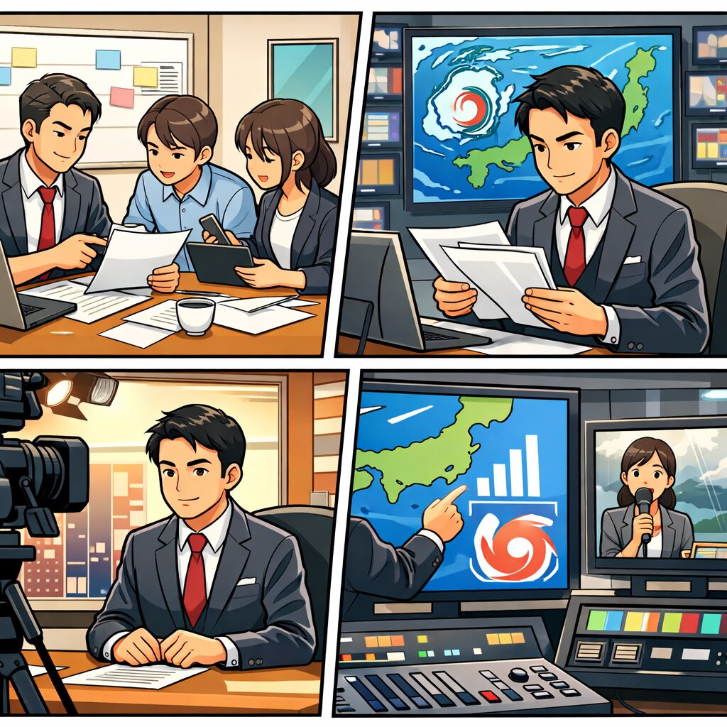 放送前の打ち合わせ、原稿確認、最新ニュースの差し替え、特集の進行確認など、“番組が始まるまで”にやることが山ほどあります。