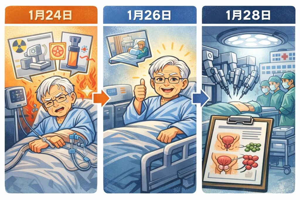 • 1月28日:ダヴィンチ手術の終了と、摘除範囲(膀胱・前立腺・右腎・右尿管)を具体的に報告。