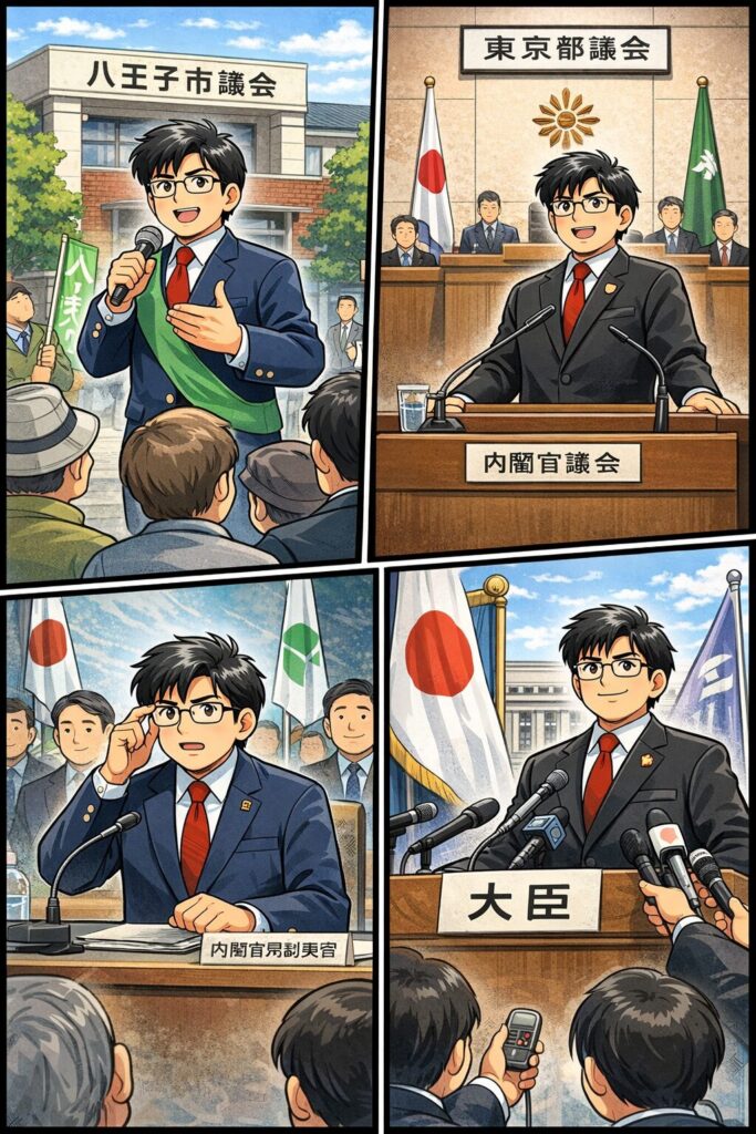 八王子市議会議員、東京都議会議員と、まず地方議会で経験を積み、その後に衆議院議員として国政に進んでいます。