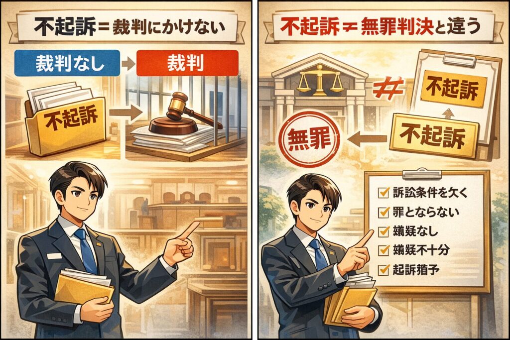- 不起訴は「裁判にかけない」という検察の判断で、裁判で有罪・無罪を判断する手続き自体が始まっていません。よって、言葉の受け止めは “有罪確定ではない/ただし無罪判決でもない” が基本です。