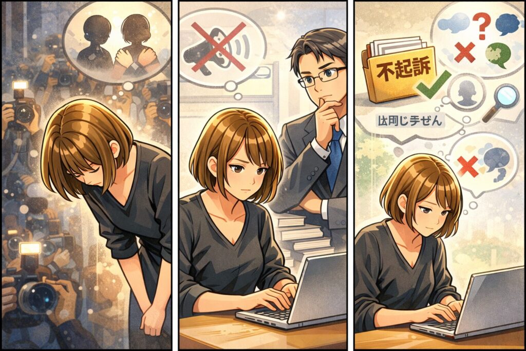 だから本件は、「不起訴になった」事実と、本人が“説明は控える”と述べている事実を丁寧に書くのが最も強い、という整理になります。
