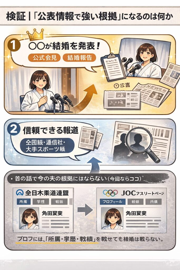 いちばん強いのは本人・所属先・公式の場での発表(結婚報告、会見コメントなど)。