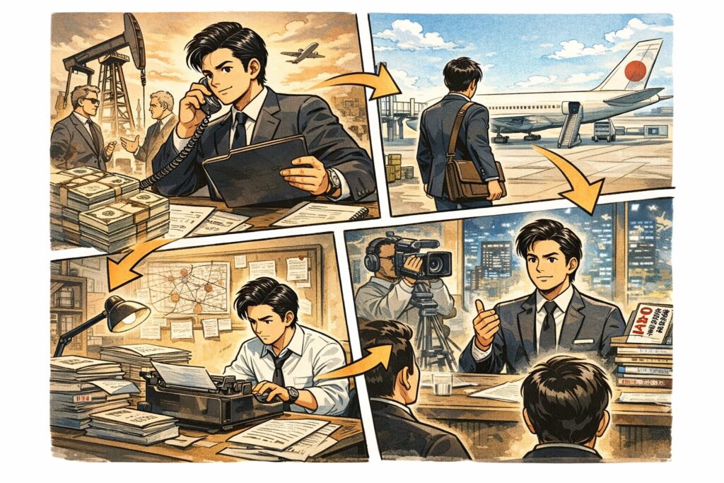 ここが重要で、落合信彦の“国際派”は、単に「アメリカで学びました」ではなく、学び→ビジネス→言論(著述・発信)が一本につながっている点で独特です。