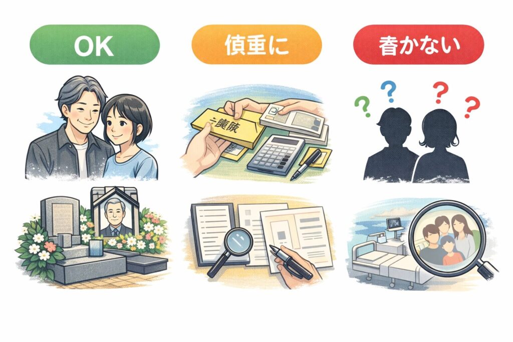 一方で、慎重に扱うべきなのは、法的な手続きや財産・相続などの話を断定で書くことです。