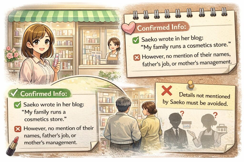 ここが検索需要の中心ですが、両親は一般の方なので、実名・勤務先・顔写真など特定につながる情報は避けるべきです。