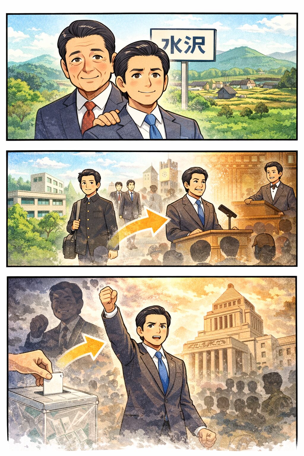 • 父が国政の場で活動(地盤・後援会・政治ネットワークを持っていた)