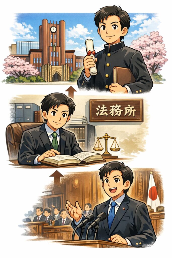 つまり学生時代を「青春ストーリー」にせずとも、東大法→弁護士→国政という流れを確かな情報でつなぐだけで、学生時代は十分“意味のあるパート”になります。