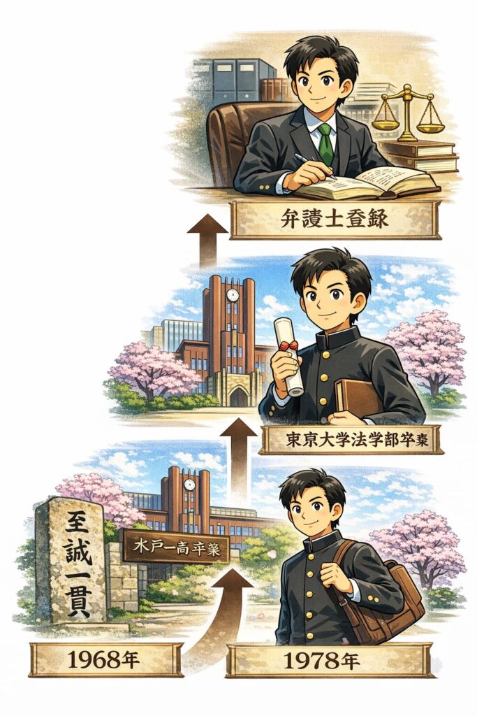 また毎日新聞の連載記事でも、水戸一高卒で東大法学部卒という骨格で紹介されています。