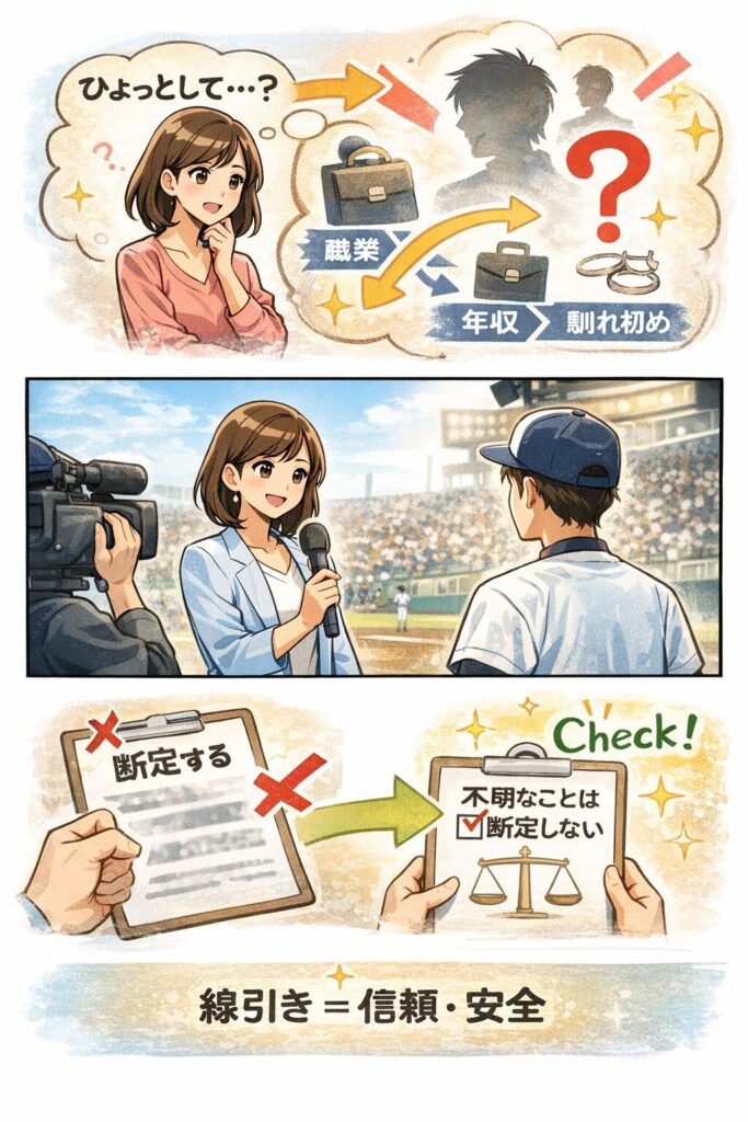 - スポーツキャスターとして取材対象との距離感を保つプロ意識が背景にある可能性