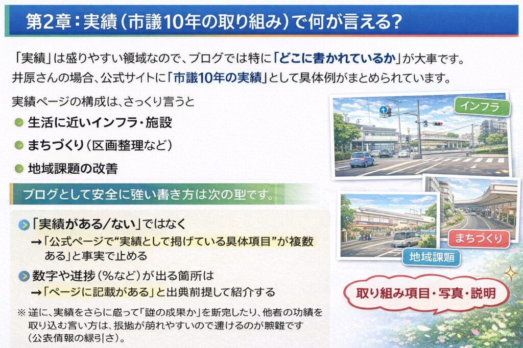 - 実績は、公式サイトに「市議10年の実績」として具体項目がまとまっており、ブログでは“公式に掲げる実績”として紹介するのが安全です。