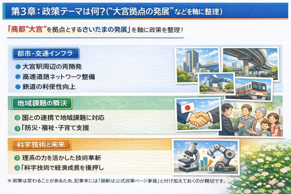 - 政策テーマは、都市・交通インフラ(大宮拠点、道路・鉄道等)を中心に、具体策が列挙されています。