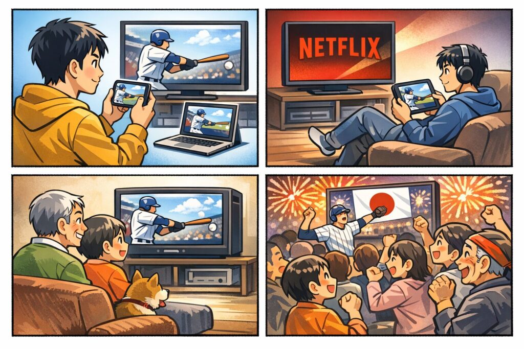 2026年の第6回WBCは、日本国内ではNetflixが全47試合をライブ+オンデマンドで配信し、地上波放送は予定されていない形です。
