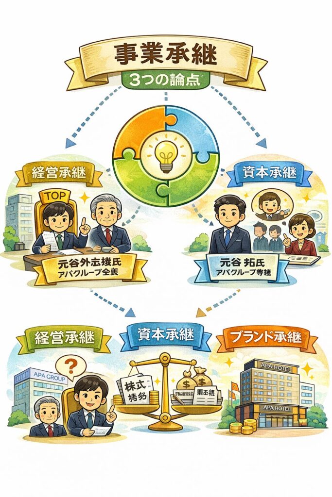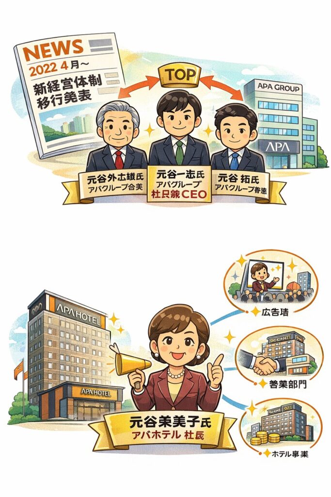 アパグループは2022年4月に元谷一志CEO中心の新体制へ移行しており、承継はすでに運用段階に入っています。