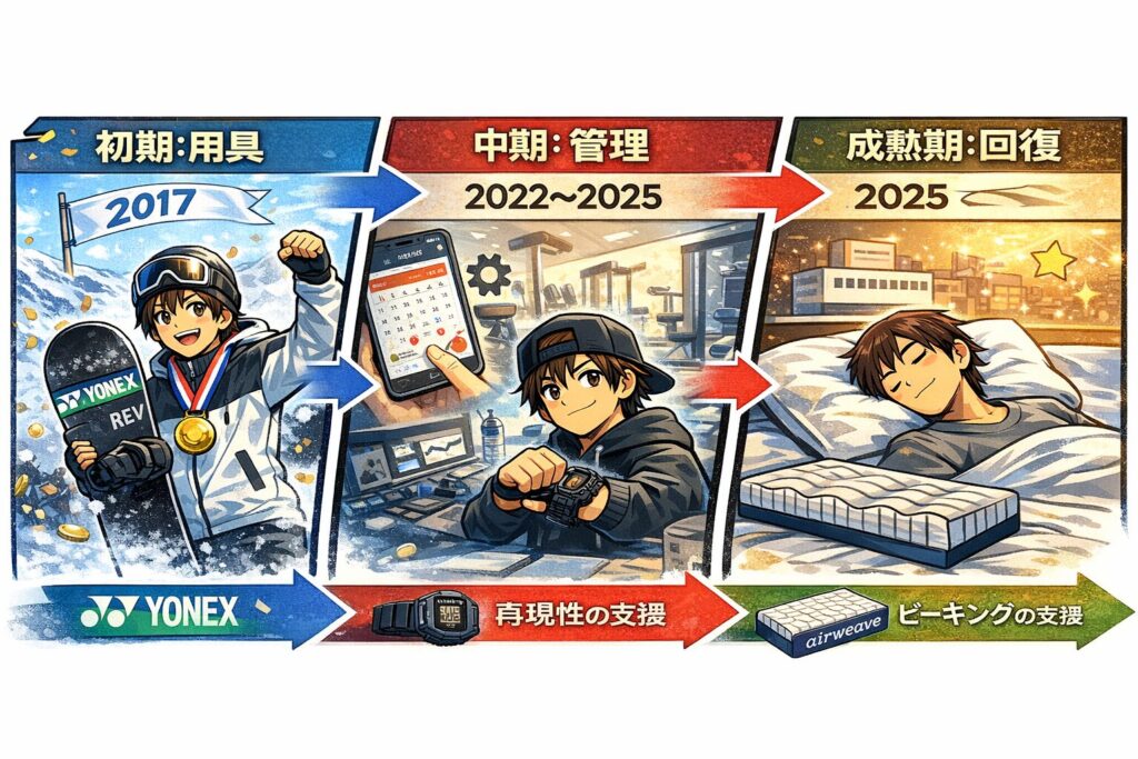 そして2025年にエアウィーヴが加わり、支援が“ギア(滑る道具)中心”から“コンディション(寝具・回復)”へ拡張した形になります。