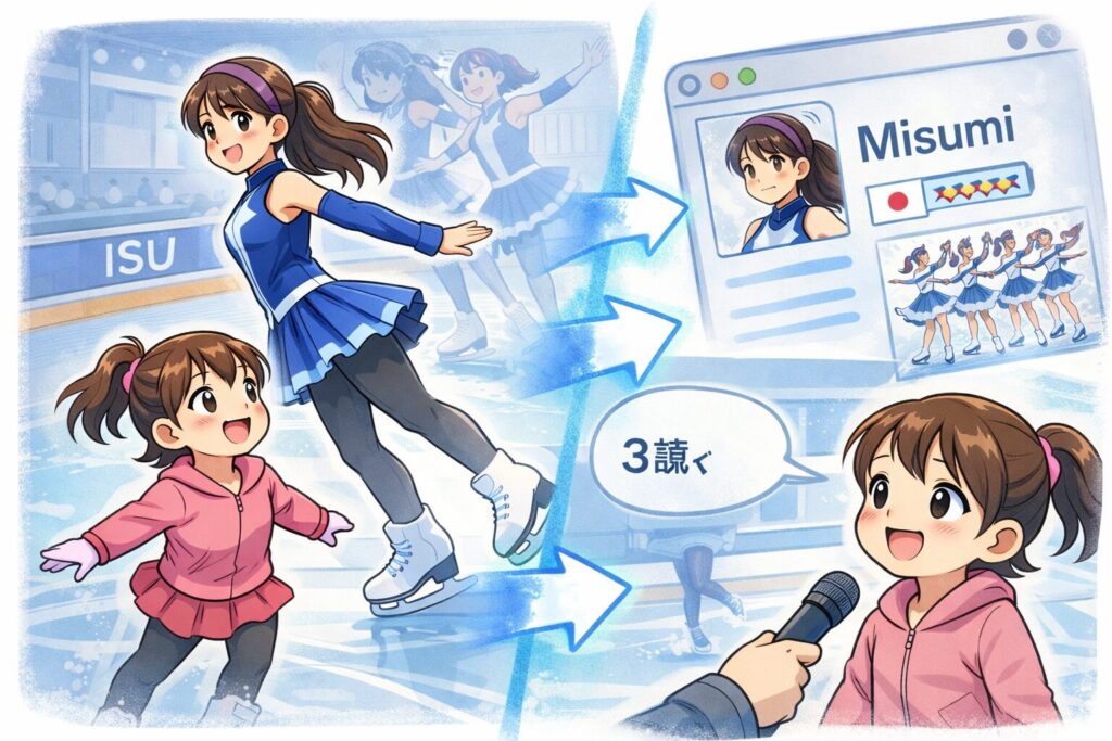 国際スケート連盟(ISU)の選手紹介で、成美さんが“姉の後について”スケートを始めたこと、姉(Misumi)がシンクロの日本チームで競技していたことが記載されています。