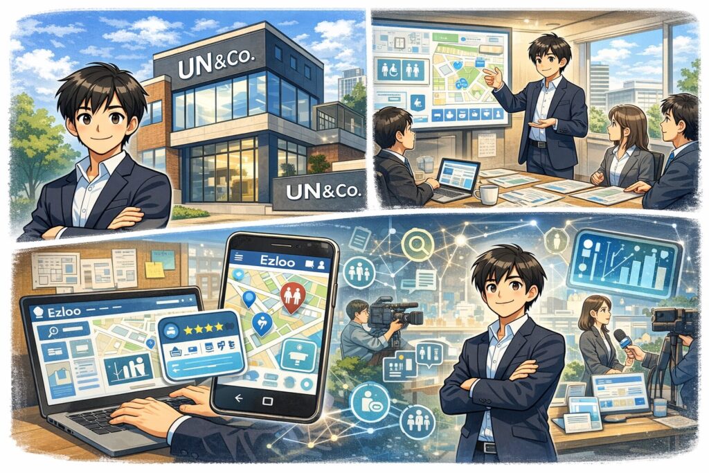 また、外部インタビュー記事でも、トイレ検索アプリ「Ezloo」の開発や自治体との実証実験に触れています。