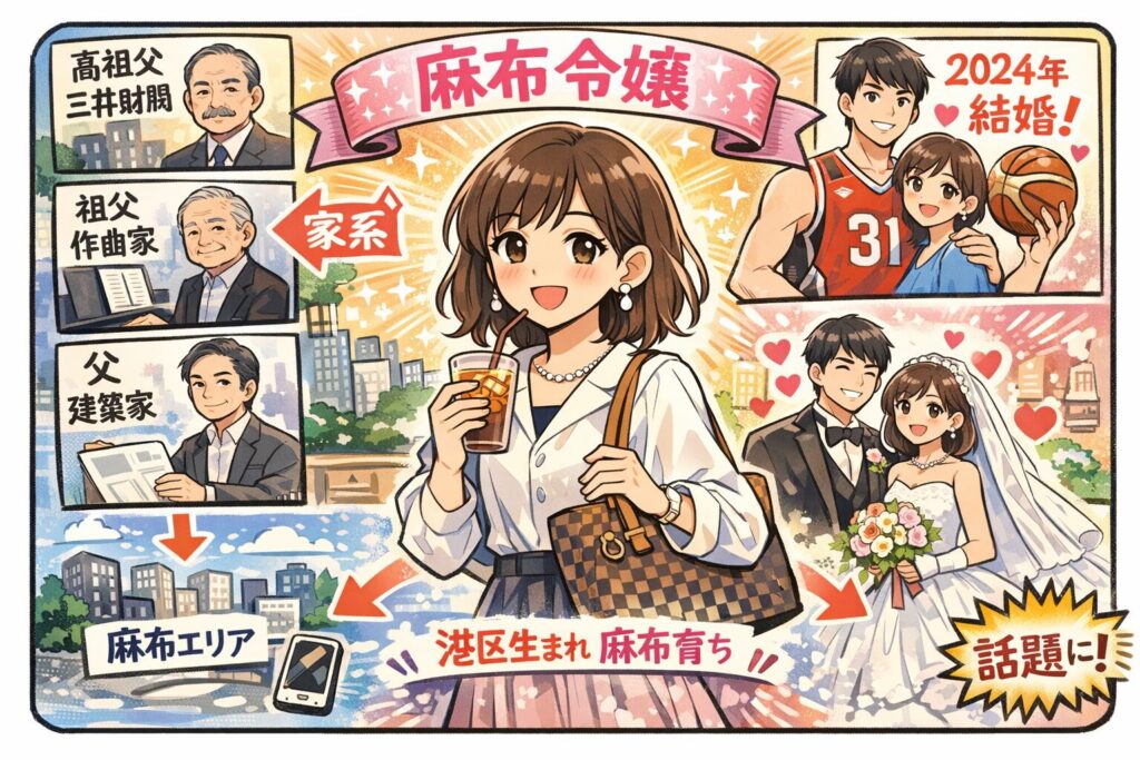 東京カレンダー側も「港区生まれ、麻布育ち」の文脈で、家系(高祖父・祖父・父)まで含めて“麻布令嬢”として紹介しています。