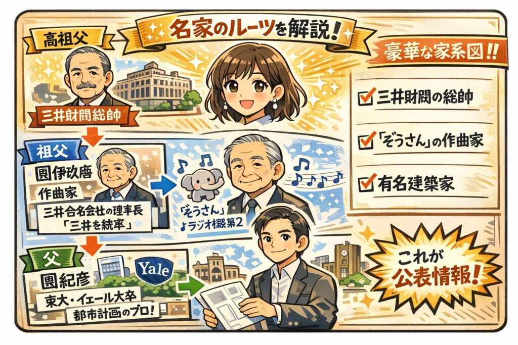團遥香さんは、三井財閥を率いた團琢磨を高祖父に持ち、祖父は作曲家の團伊玖磨、父は建築家の團紀彦という“家系の強さ”が媒体側でも紹介されています。