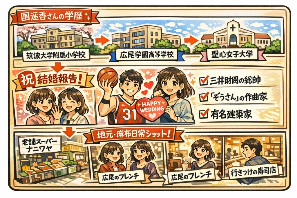 学歴も筑波大附属小→広尾学園→聖心女子大卒と整理され、“育ち”の文脈と一致します。