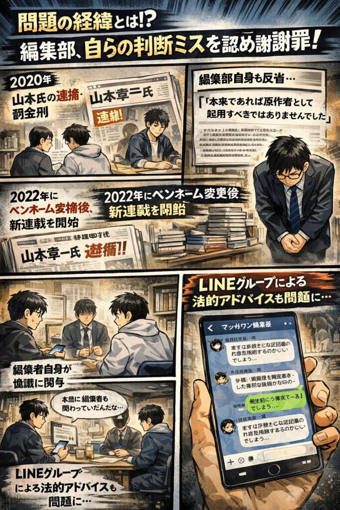 編集部は逮捕・罰金刑の事実を把握しながら、ペンネームを変えて同氏を起用し続けたという判断の誤りを認め、被害者・読者・関係者へ謝罪しています。
