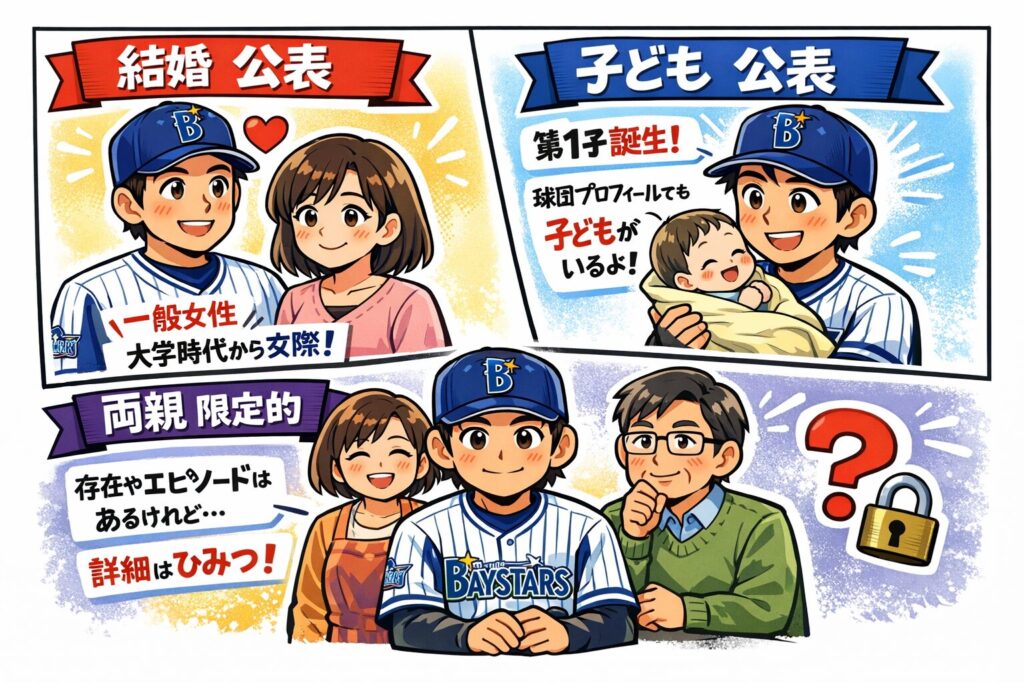 - 子ども:公表(第1子誕生が報道・球団プロフィールでも“子ども”言及あり)