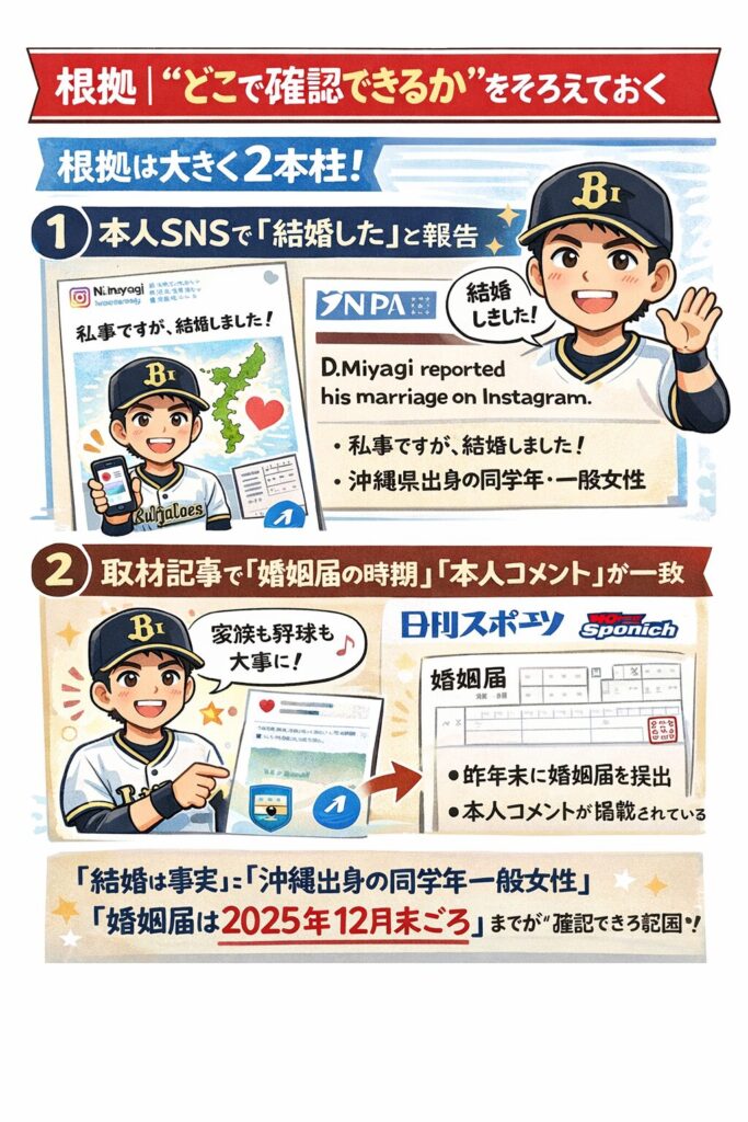 パ・リーグ公式系の英語記事でも、宮城投手がInstagramで結婚を報告した旨が整理されています。