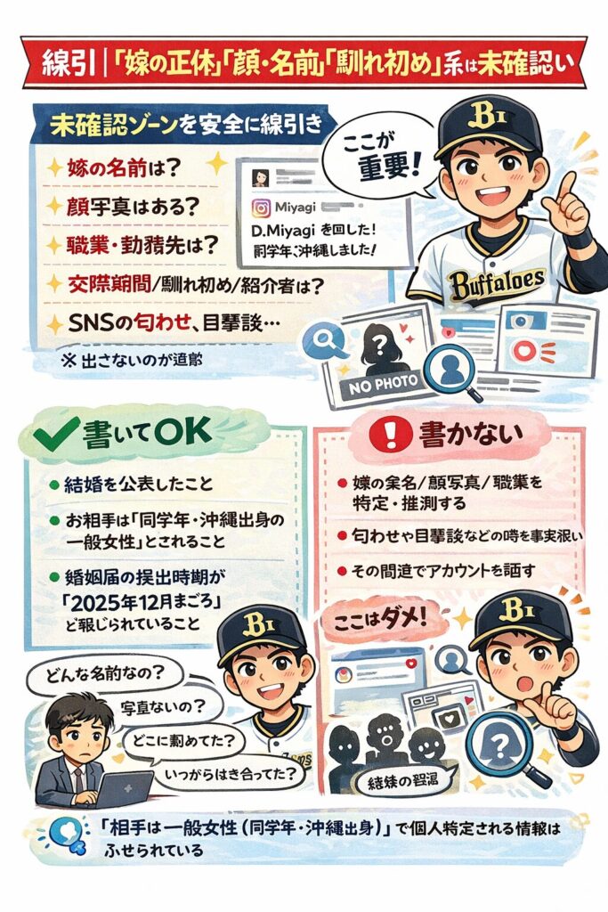 • 宮城大弥投手の結婚は公表されている(=事実)
