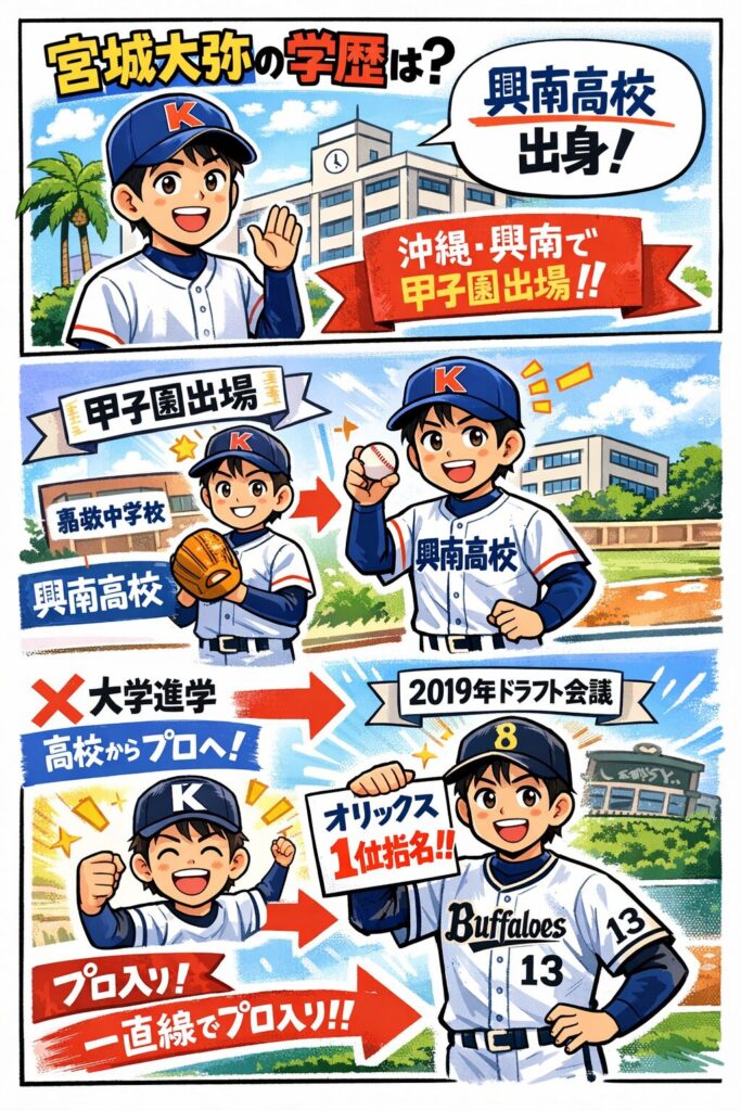 この“プロ入りまで”を時系列で見ると、宮城投手は興南で甲子園・代表経験 → 評価の積み上げ → ドラフト1位で高校からプロという一直線のルートです。