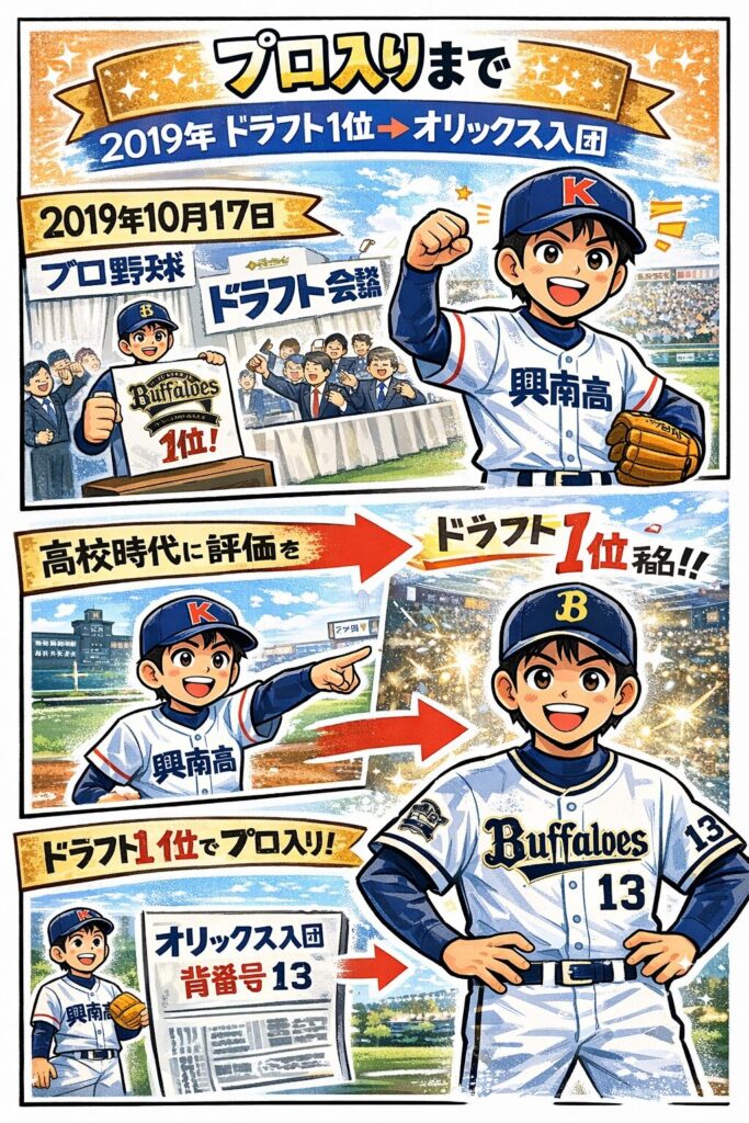 ポイントは、大学進学ではなく“高校からプロ”というルートを選び、2019年ドラフトでオリックスから1位指名を受けて入団したこと。