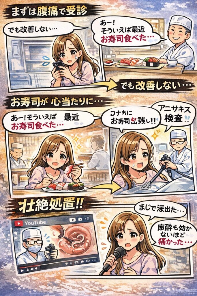 つまり、生魚(寿司)→強い腹痛→検査で判明という、典型的に話題化しやすい経緯でした。
