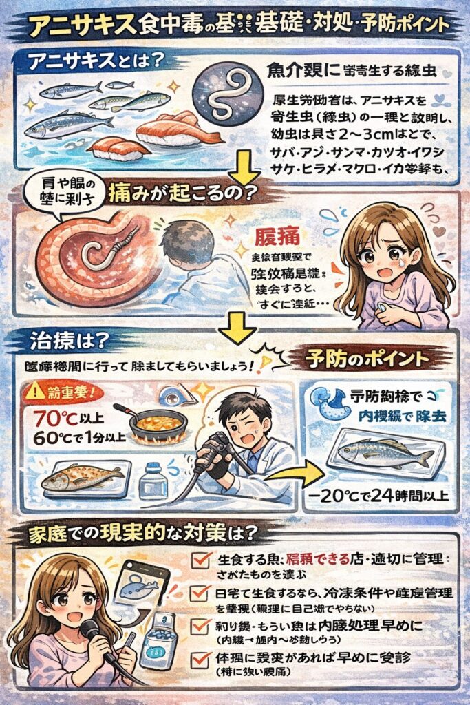 この記事では、今回の投稿内容→過去の体験談(寿司がきっかけ)→アニサキスの基礎知識と予防ポイントを、公表情報ベースで分かりやすく整理します。