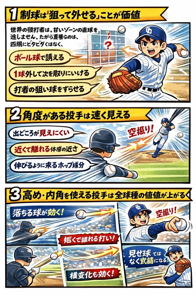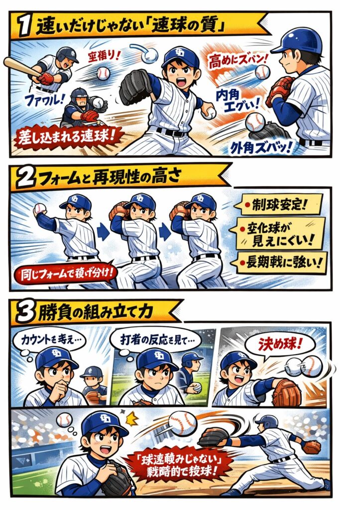 でも、メジャーや国際舞台で評価されるのは速さ単体ではなく、速球を“武器として成立させる総合力”です。