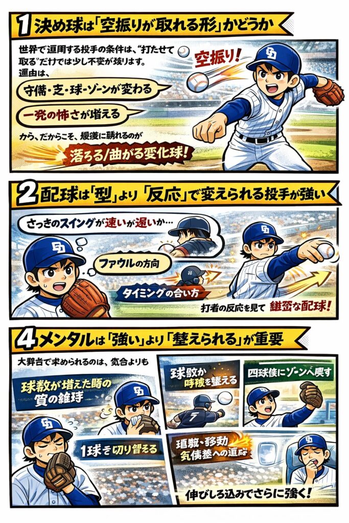 という自己調整能力。これができる投手は、環境が変わっても崩れにくい。若い投手ほど、この能力が伸びると一気に世界基準に近づきます。