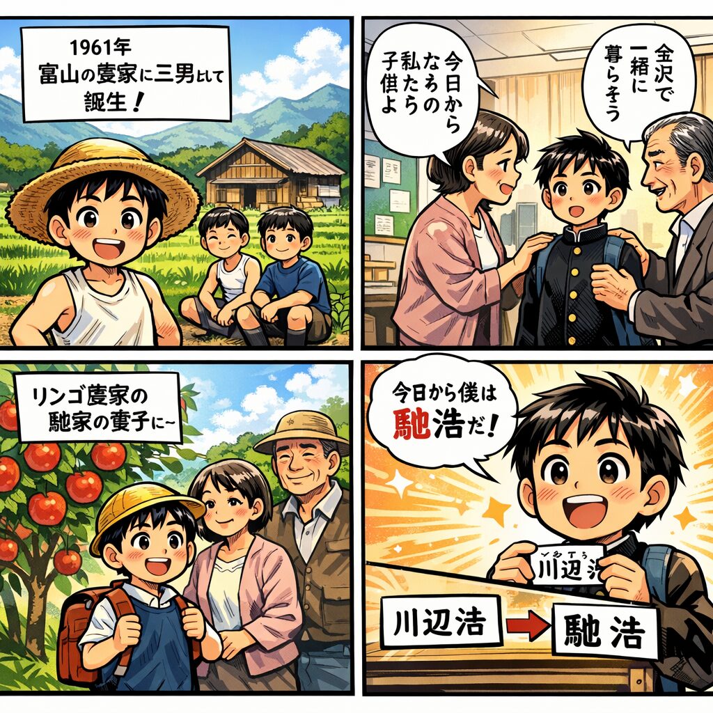 馳浩氏は1961年、富山県の農家の三男として生まれましたが、小学3年生のときに石川県金沢市のリンゴ農家・馳家の養子となり、「川辺」から「馳」へと苗字が変わりました。