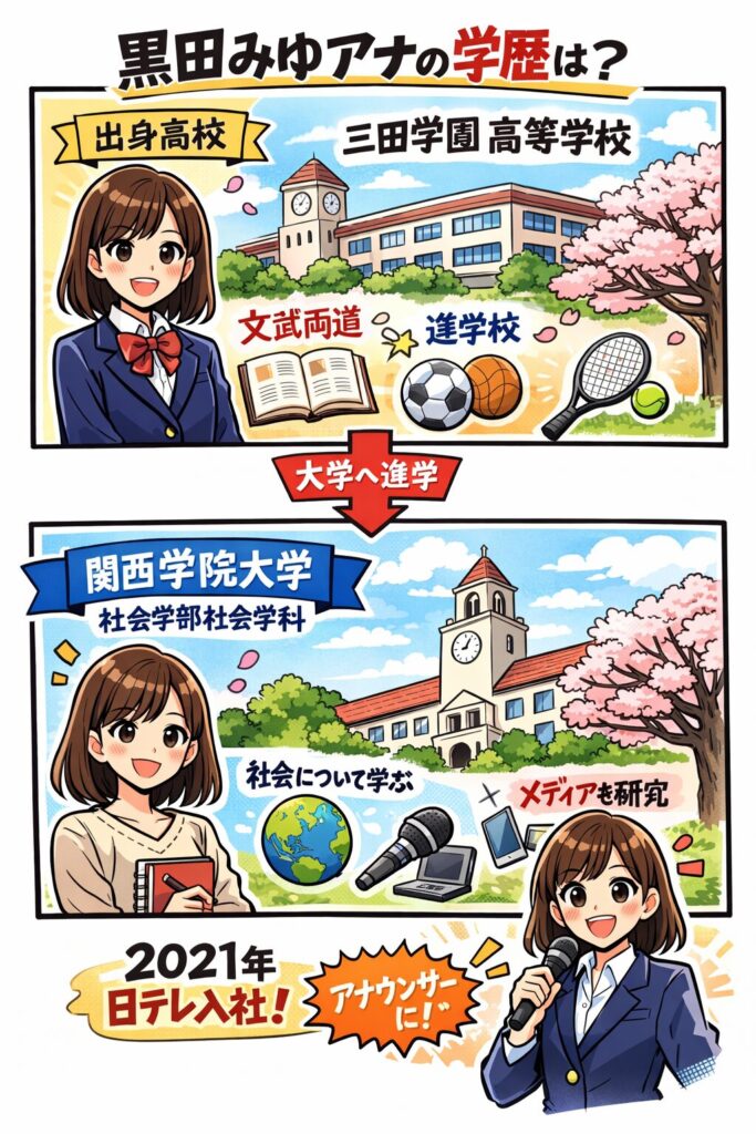 そこで今回は、「黒田みゆアナの学歴や経歴は?高校・大学から日テレ入社までを詳しく解説!」というテーマで、出身高校や大学、そして日本テレビ入社後の歩みまでをわかりやすく整理していきます。