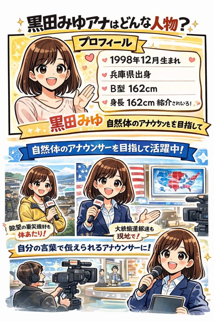 華やかな見た目だけでなく、報道・情報番組の現場で経験を積み重ねている点も、黒田みゆアナが注目される理由のひとつでしょう。
