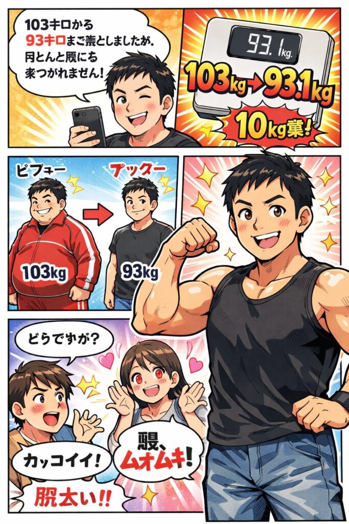 実際に体重計の表示は93.1キロとなっており、10キロ減が数字でも確認できる内容でした。