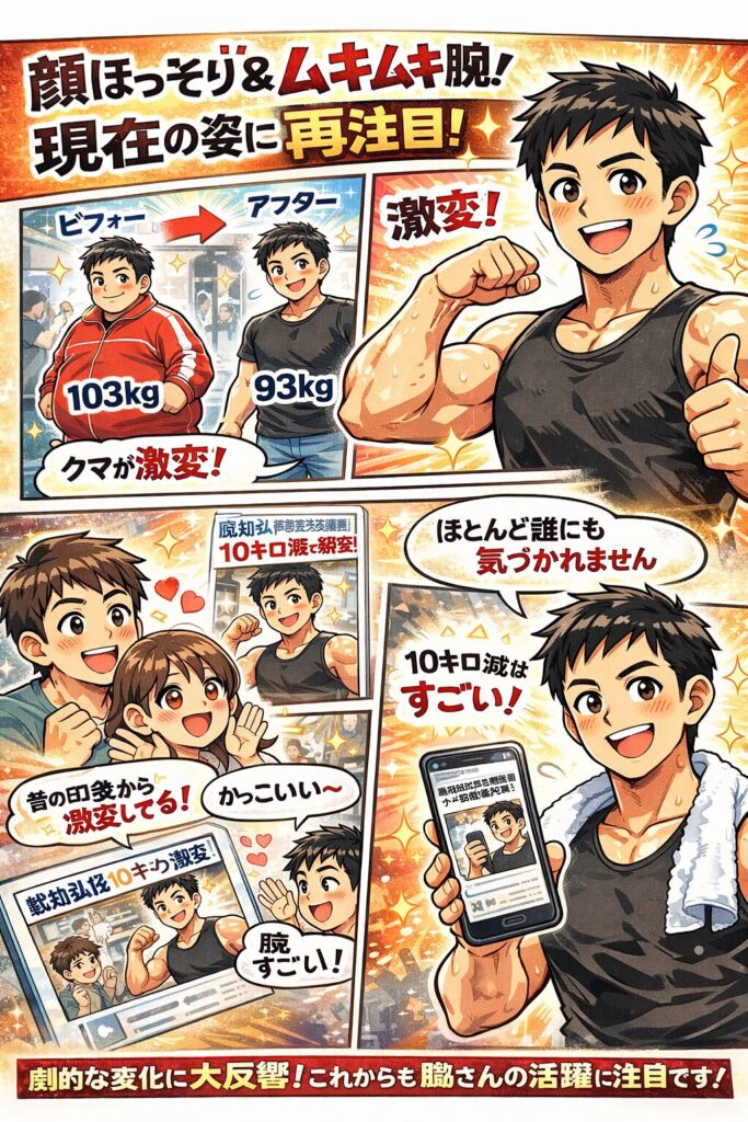脇知弘さんのダイエットが話題になっている理由は、103キロから93キロへの10キロ減量というインパクトに加え、顔まわりの変化や筋肉質な腕がはっきり見えたことにあります。