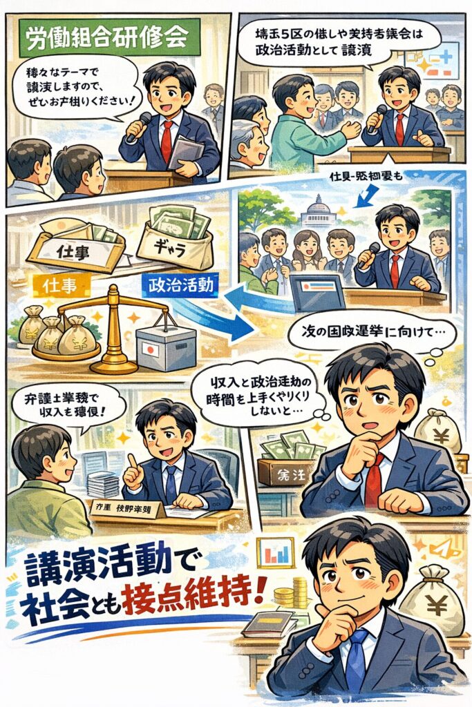 むしろ注目すべきなのは、非議員となった後も、講演や弁護士業務を通じて収入を確保しながら政治活動を続けようとしている点です。